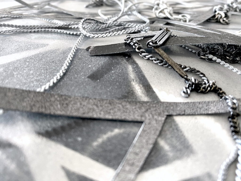 Gebrauchte Schmuckketten und Metallstäbe bilden kleine Wandobjekte, die an Fragmenten oder Überreste erinnern.